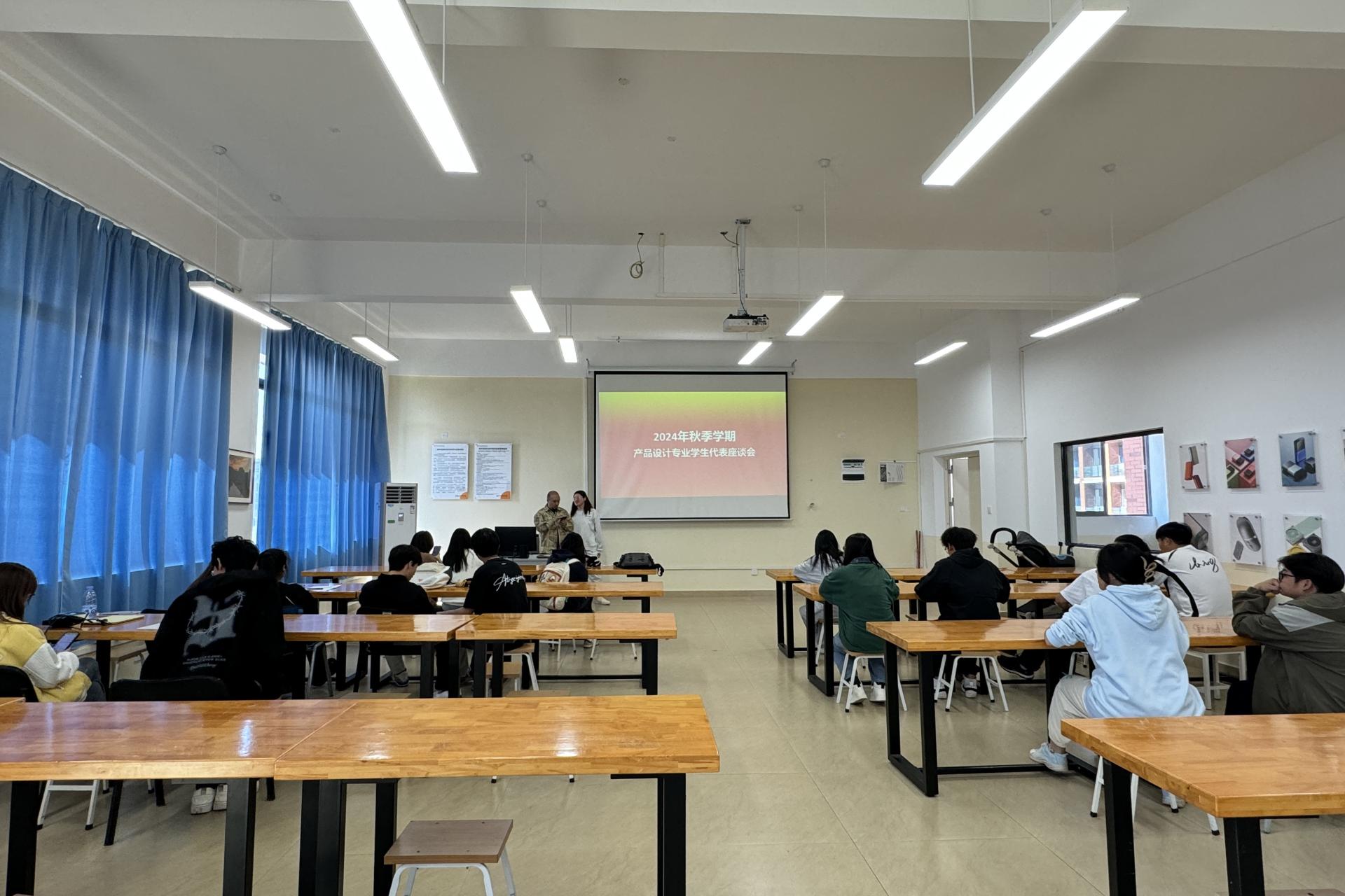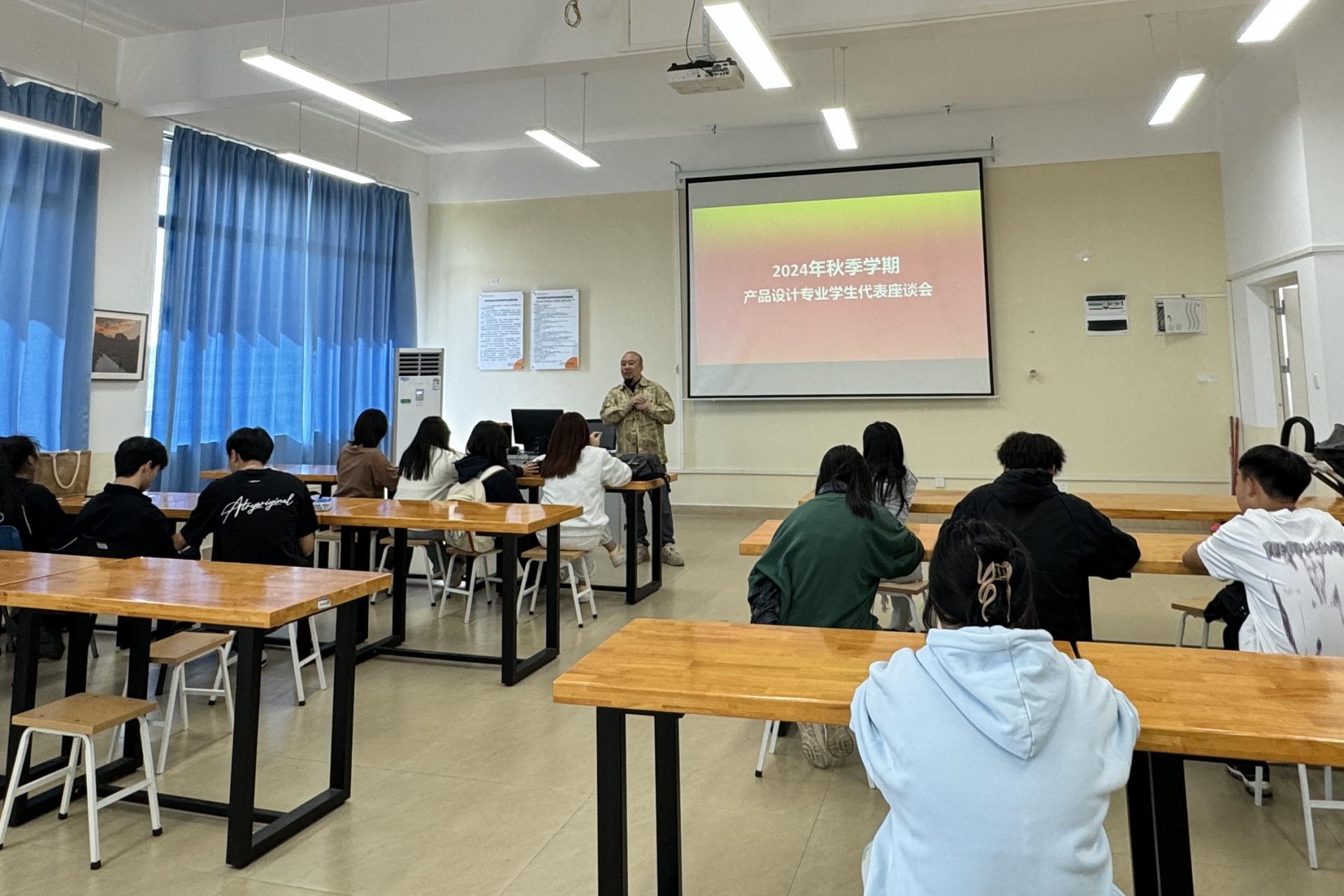 11月8日,大四到大一班级代表与产品设计专业教师齐聚一堂展开座谈会。会议由产品设计教研室主任苏锐主持,教研室全体教师参加。