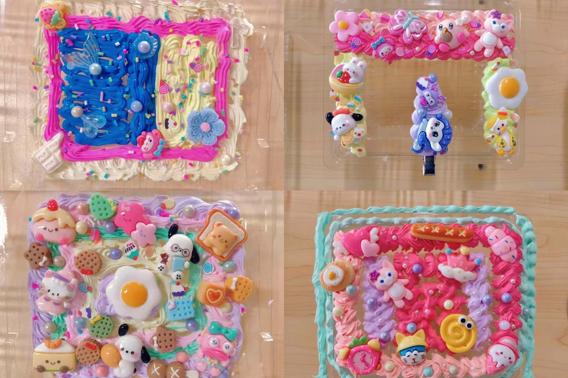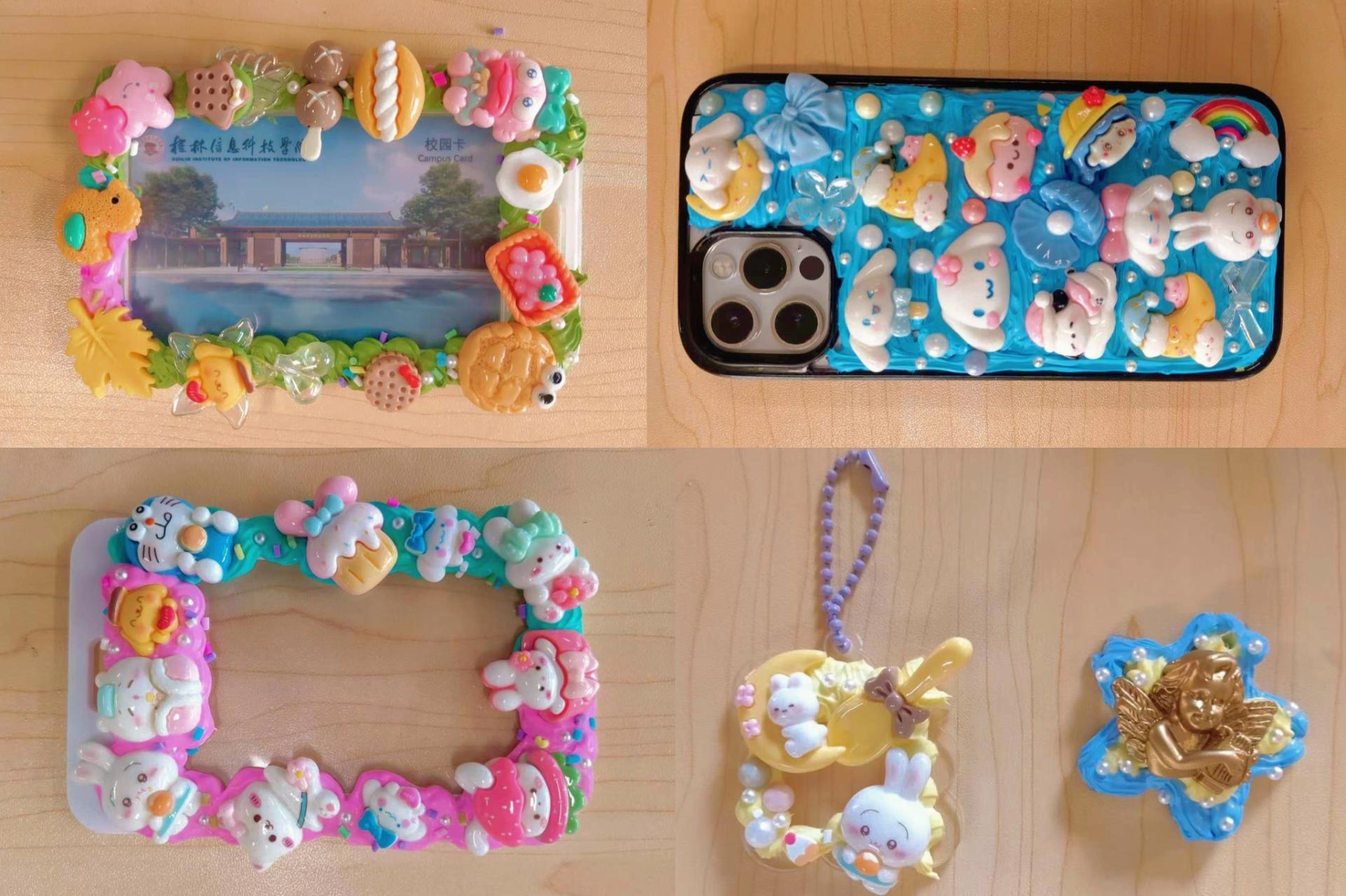 活动现场的布置温馨且雅致,桌面上整齐陈列着各类奶油胶、卡通公仔、亮片、珍珠、树脂配件等材料,以及手机壳、小镜子等制作载体,浓厚的创作氛围油然而生。活动伊始,张菁芮老师向同学们展示了多款奶油胶手工成品,包括色彩明快的手机壳、精致可爱的化妆镜、实用美观的收纳盒等,这瞬间激发了大家的创作热情。随后,张老师结合实物进行演示,详细阐释了奶油胶的特性以及使用工具的操作方法,着重示范了挤花技巧,从基础的圆形、星形挤法到进阶的渐变花纹制作,同时分享了装饰物搭配的色彩协调原则与层次感营造技巧,并耐心解答了同学们提出的疑问,为后续创作奠定了坚实基础。在自主创作环节,同学们围坐在一起,构思设计方案,创作风格各异的作品,现场洋溢着欢声笑语。
