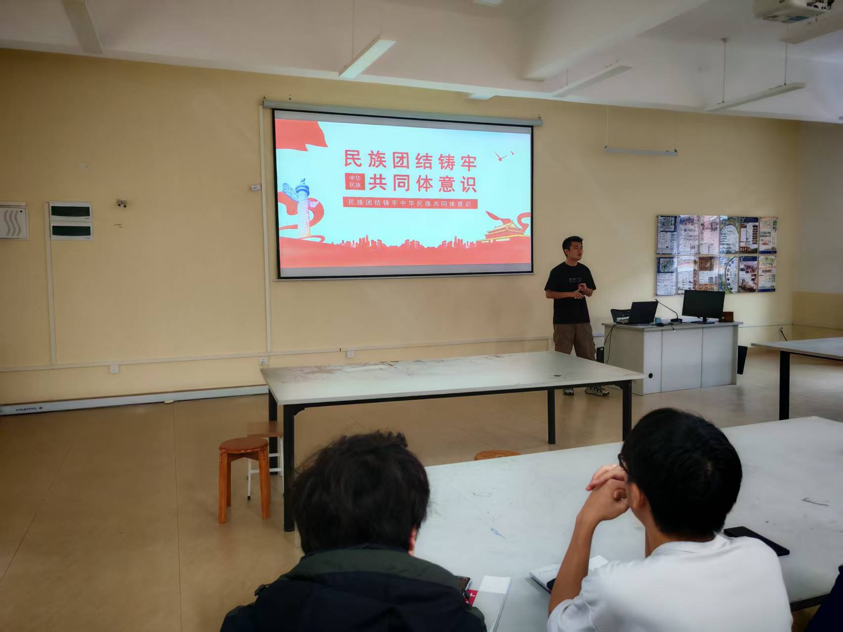 4月24日,2024级视觉传达设计1班在E314教室举办"铸牢中华民族共同体意识"专题教育活动。班主任耿思凡老师组织全体同学通过"理论阐释+故事分享+红色传承"的形式,深入开展了民族团结主题教育。