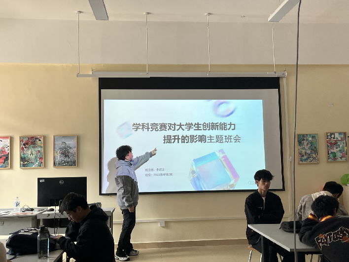 10月29日,太阳集团tcy8722网站创意设计学院E栋308教室内,2022级环境设计2班在李运龙老师的带领下,举办了一场主题为“学科竞赛对大学生创新能力提升的影响”的班会。