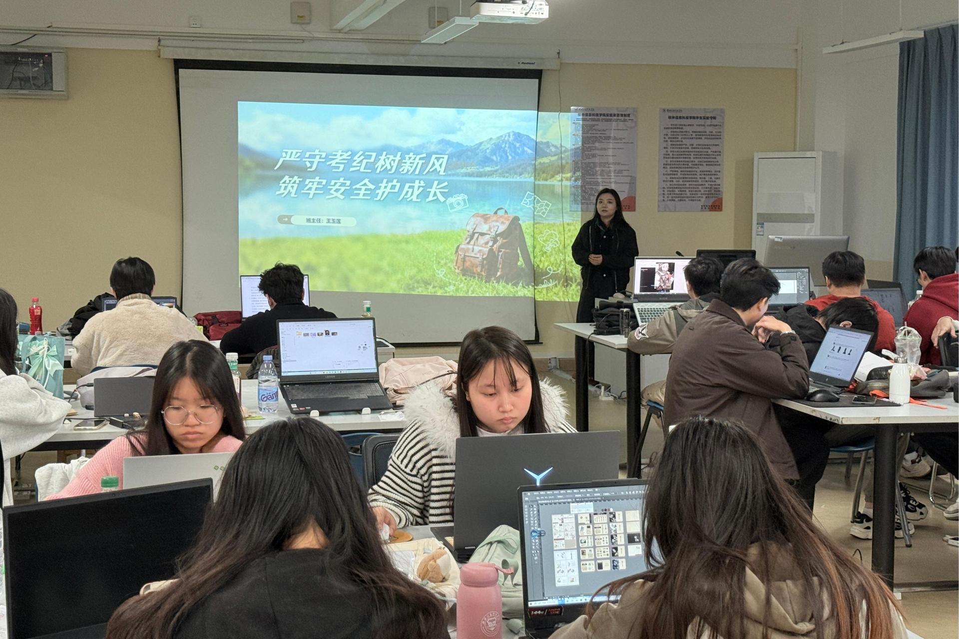 为进一步强化学生考风考纪意识,夯实校园安全防线,12月4日,2022级视觉传达设计专升本1班在守正楼G301教室召开“严守考纪树新风,筑牢安全护成长”主题班会。学业导师王玉莲老师主持班会,全体同学参会,围绕期末考风考纪与校园安全两大核心议题展开深入学习与交流。