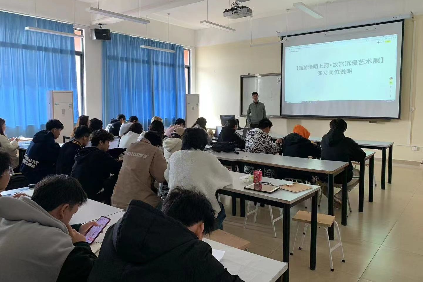 近日,深圳徐来科技传媒文化传播有限公司莅临我院,于创意设计学院E401教室隆重举办了一场招聘宣讲会。本次宣讲会汇聚了2021级动画专业的学生,旨在深化我院师生对深圳徐来科技传媒文化传播有限公司的全面了解,并深入剖析公司近期推出的《画游清明上河-故宫沉浸艺术展》项目。此举不仅为即将踏入社会的大三学生提供了优质的实习机会,同时也为企业选拔优秀人才搭建了一个高效的平台。