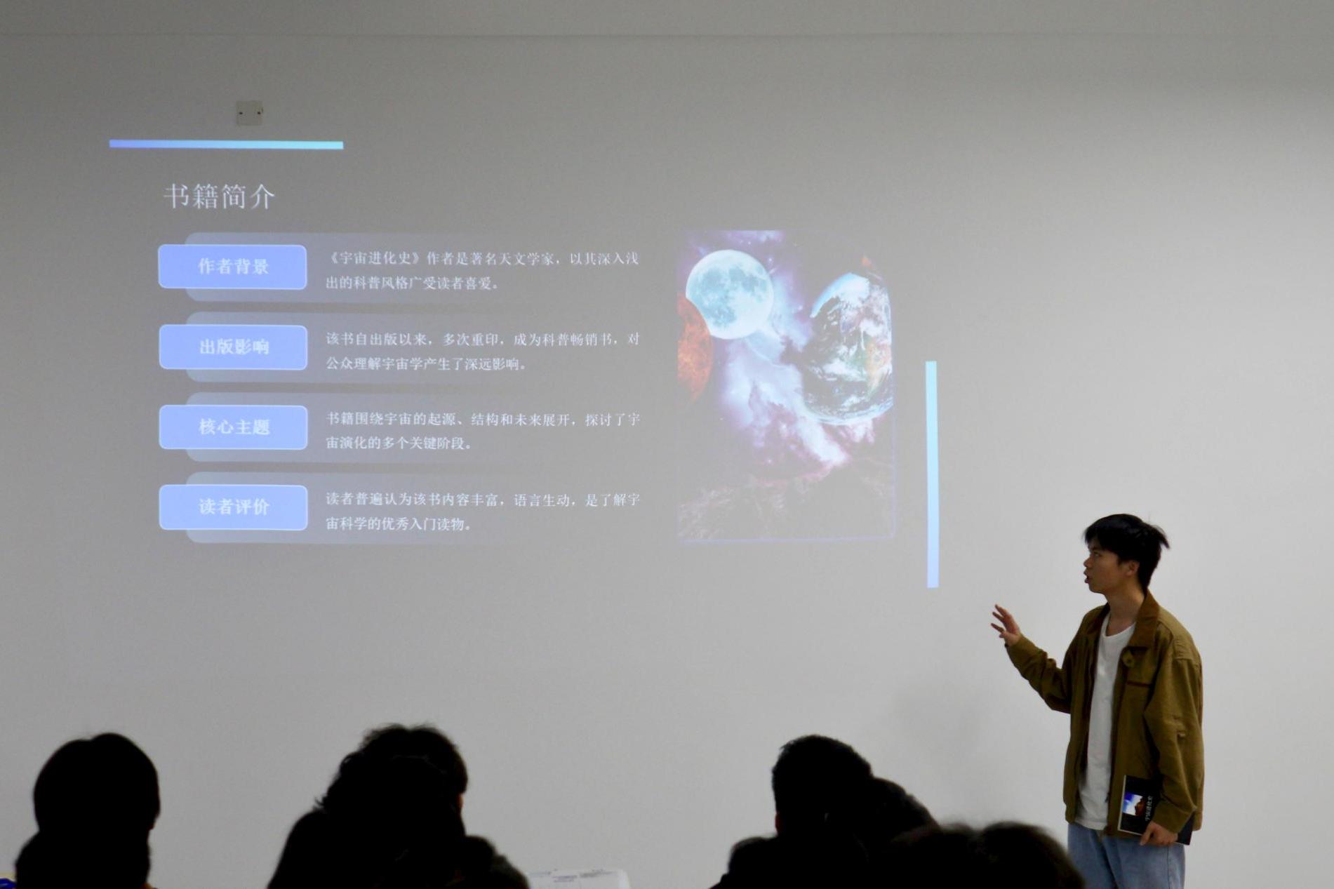 活动中,同学们逐次上台分享科普探索类的经典著作,带领观众遨游知识的海洋。第一位同学介绍了达尔文的《物种起源》,从理论、感悟和体会等方面阐述了生物进化论的核心观点及其对现代科学的深远影响;第二位同学分享了《宇宙进化史》,利用作者背景、出版影响等角度介绍,从宇宙大爆炸到星系形成,展现了浩瀚宇宙的壮丽图景。