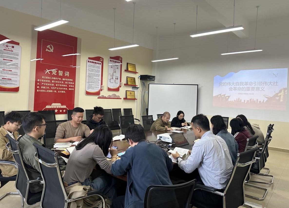 创意设计学院教工党支部为了深刻领会党的伟大自我革命引领伟大社会革命的重要意义,增强党员党性修养,加强党员建设,于11月10日开展主题教育会,会议由支部书记梁瑛主持。