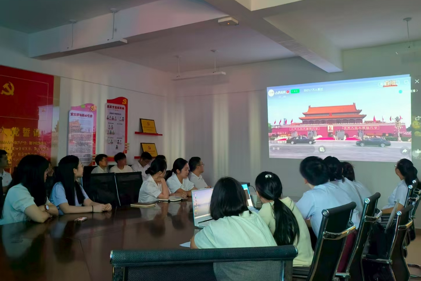 上午9时,阅兵式正式开始,同志们的目光都聚焦在大屏上。当习近平总书记发表重要讲话并检阅部队时,全体党员神情庄重,认真观看。阅兵仪式盛况空前,各受阅部队的整齐方阵、先进装备一一展现在屏幕上,彰显了伟大祖国的强大实力,展示了中国人民解放军的威武雄壮。直播结束后,党员同志们纷纷表示,此次阅兵仪式让大家感受到祖国的强大力量和民族凝聚力,内心充满自豪和骄傲。