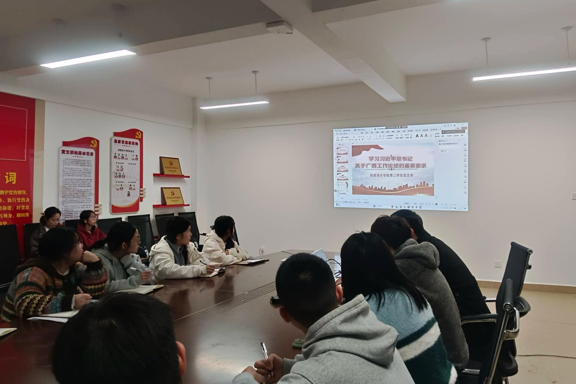 2025年10月22日,创意设计学院第二学生党支部于守正楼G517教室召开专题学习会,集中学习领会习近平总书记关于广西工作的重要论述和指示要求。本次学习会由刘思同志主持,全体党员参会。