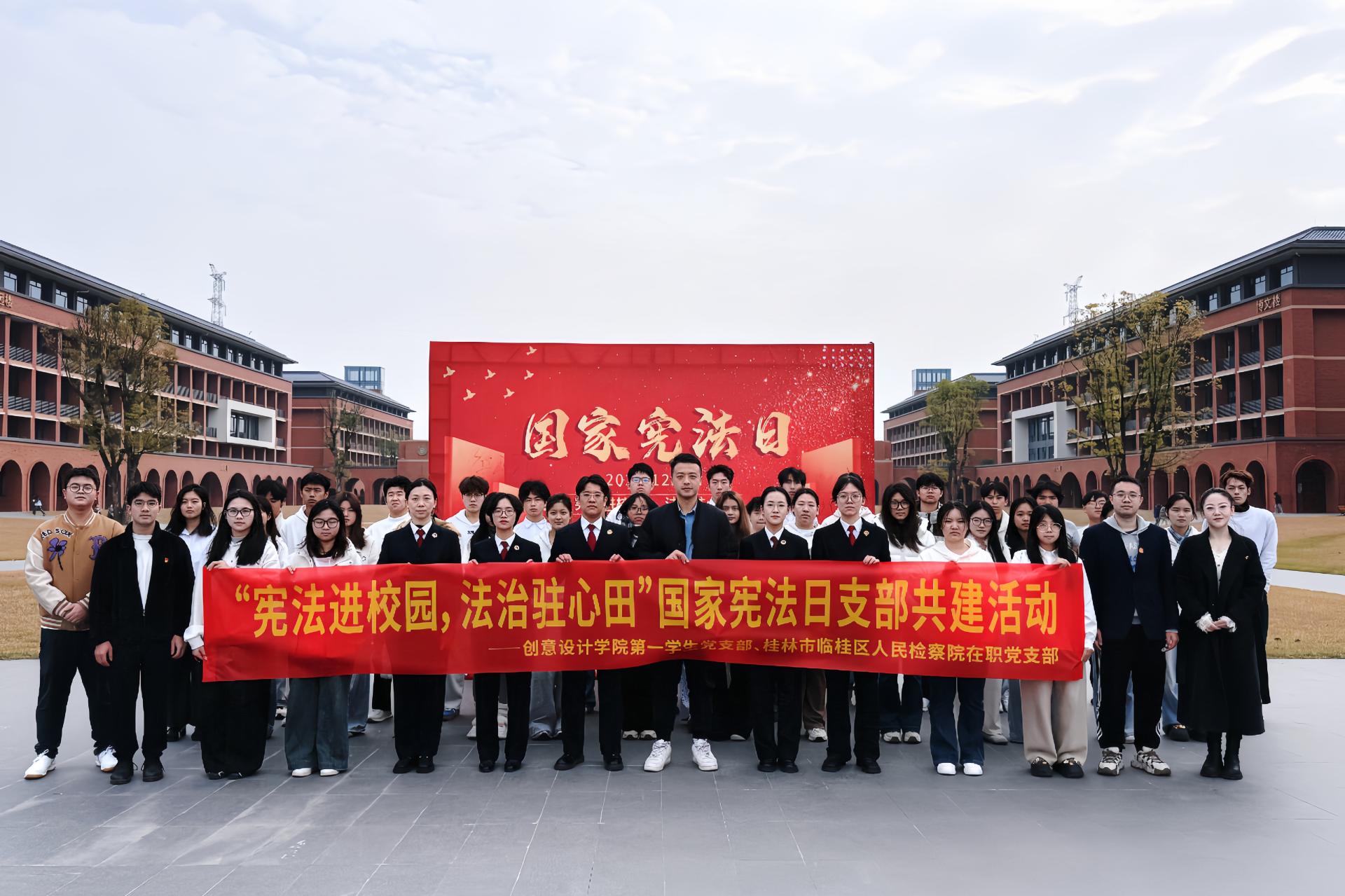 为深入推进法治教育融入党建与思政工作,增强师生党员、团员的宪法意识和法治素养,12月4日上午,在第十二个国家宪法日到来之际,创意设计学院第一学生党支部与桂林市临桂区人民检察院在职党支部携手开展了支部共建暨“宪法进校园,法治驻心田”国家宪法日主题活动。我院党员师生代表、团员代表共同参加了本次活动。活动在庄严的“宪法晨读”中开始,全体成员在检察官的带领下齐声诵读宪法条文,在朗朗诵读声中感悟宪法权威,筑...