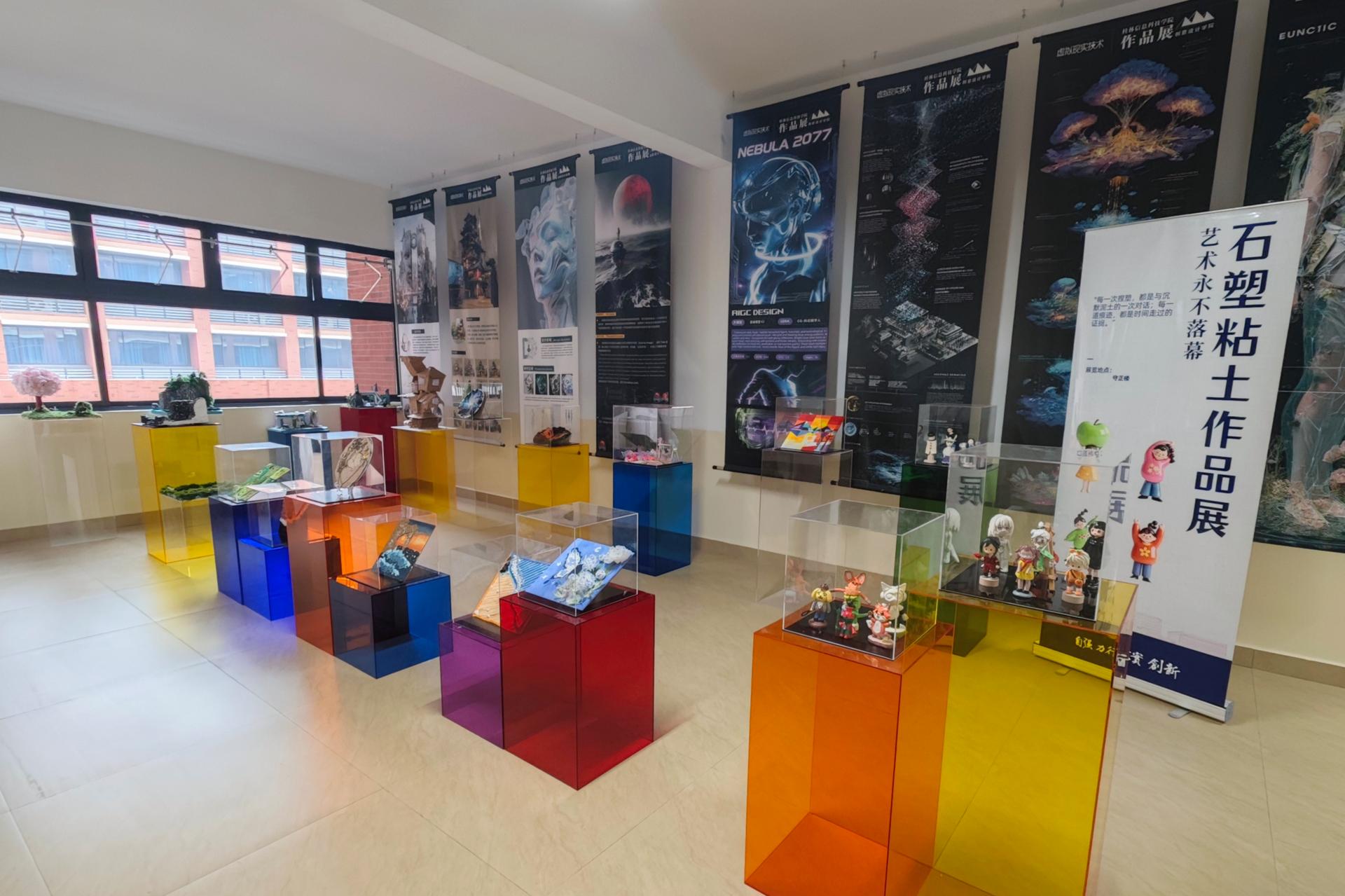 我院虚拟现实技术专业实训课程结课作品展于1月13日在守正楼三楼公共区域正式开展。本次展览汇集了大一、大二及专升本年级学生在《虚拟概念实训》《数字化视觉设计》和《三维场景实训》三门课程中完成的实体创作成果。展品聚焦于实物模型的精湛技艺与创意表达。在《虚拟概念实训》课程中,学生将前期设计课程中构思的人物形象,通过手工粘土捏塑转化为生动立体的实体模型。《数字化视觉设计》课程则展出了学生运用纸张、木材、金...