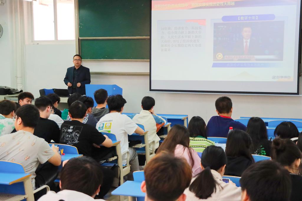 4月26日,学校党委书记甘勇在22104教室为通信工程专业大一学生讲授形势与政策课。
