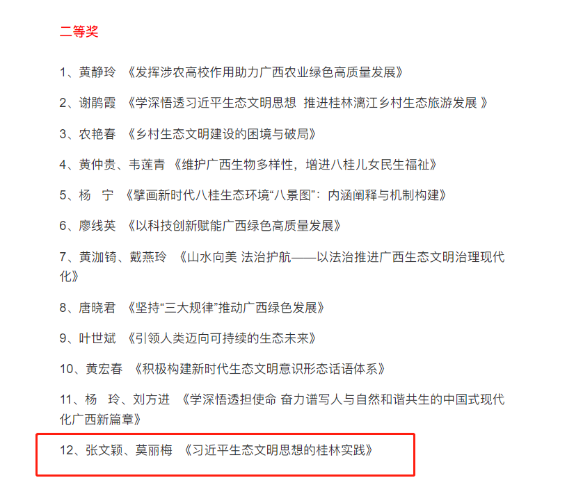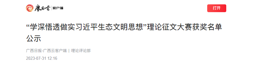 近日,由自治区生态环境厅和广西日报社联合主办的“学深悟透做实习近平生态文明思想”理论征文大赛获奖名单揭晓,太阳集团马克思主义学院张文颖、莫丽梅老师撰写的《习近平生态文明思想的桂林实践》荣获大赛二等奖。获奖作品根据公开数据,探讨了十余年间桂林市践行习近平生态文明思想取得的成果和经验,对未来生态文明建设进行了展望。
