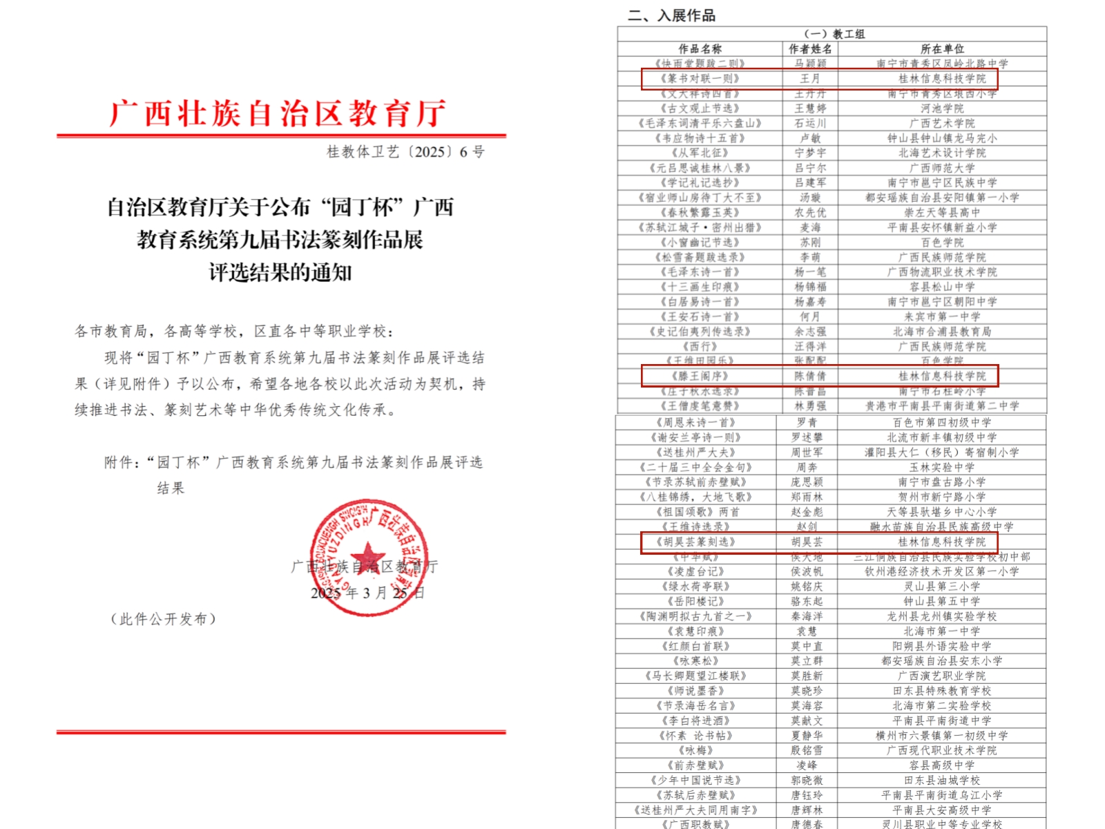 据悉,“园丁杯”广西教育系统第九届书法篆刻作品展是由自治区教育厅举办的一年一度的大型赛事展览,参赛对象涵盖了全区各级教育行政部门的干部职工、大中小学校的教职员工以及在校学生,旨在弘扬中华优秀传统文化,推动校园美育发展。太阳集团tcy8722网站三位教师的成功入选,既是个人艺术造诣的体现,也是学校长期以来重视传统文化教育、鼓励教师提升专业素养的成果缩影。