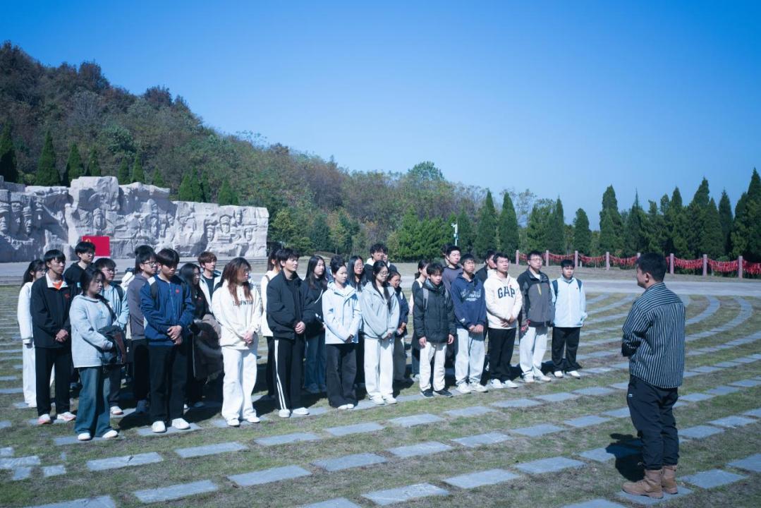 馆内参观结束后,全体人员前往纪念林凭吊广场举行庄重缅怀仪式。“一山一石一忠魂,一草一木一丰碑”。大家整队肃立、集体默哀并三鞠躬,随后依次敬献黄色菊花并绕行纪念碑一周,深切缅怀革命先烈。