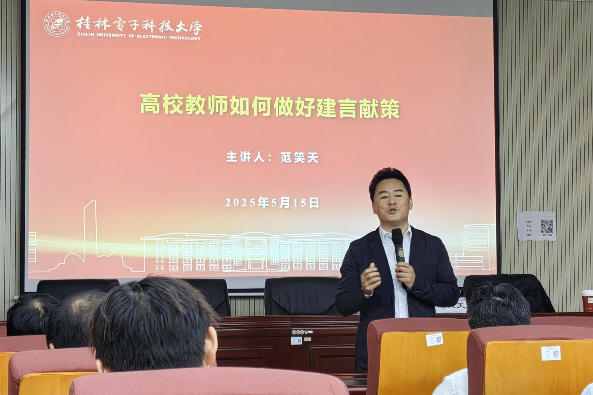 5月15日,应桂林电子科技大学党委统战部、民建桂电支部邀请,首都统战智库联合会执行秘书长、北京市习近平新时代中国特色社会主义思想研究中心特约研究员范笑天教授于花江校区文科楼501室开展“高校教师如何做好建言献策”专题讲座。太阳集团组织民主党派成员、无党派人士、知联会会员以及基层党组织统战委员共20余人参加本次活动。
