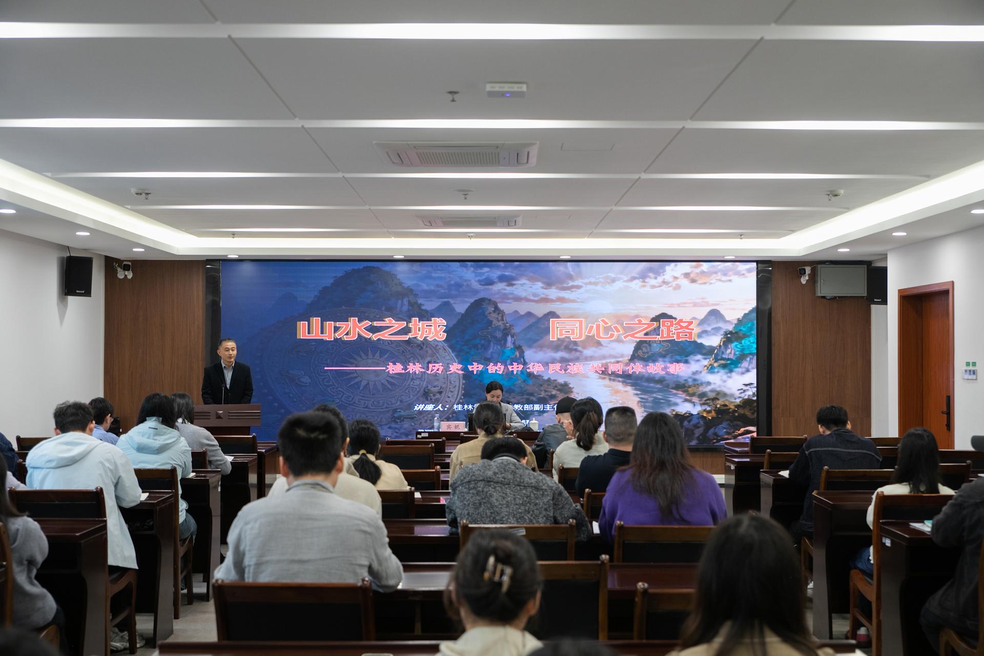 李书记最后表示,宾妮主任的讲解以文物为媒、以历史为脉,让大家清晰看到桂林各民族在长期交往中形成的命运共同体,为全体参会人员上了一堂生动的民族团结教育课。他强调,各基层党组织、统战工作者及党外人士要以此次讲座为契机,深入挖掘桂林本地民族交融历史资源,将铸牢中华民族共同体意识融入日常工作与交流中,切实把学习成果转化为促进民族团结、推动学校与地方协同发展的实际行动,为巩固中华民族共同体根基凝聚更多力量。