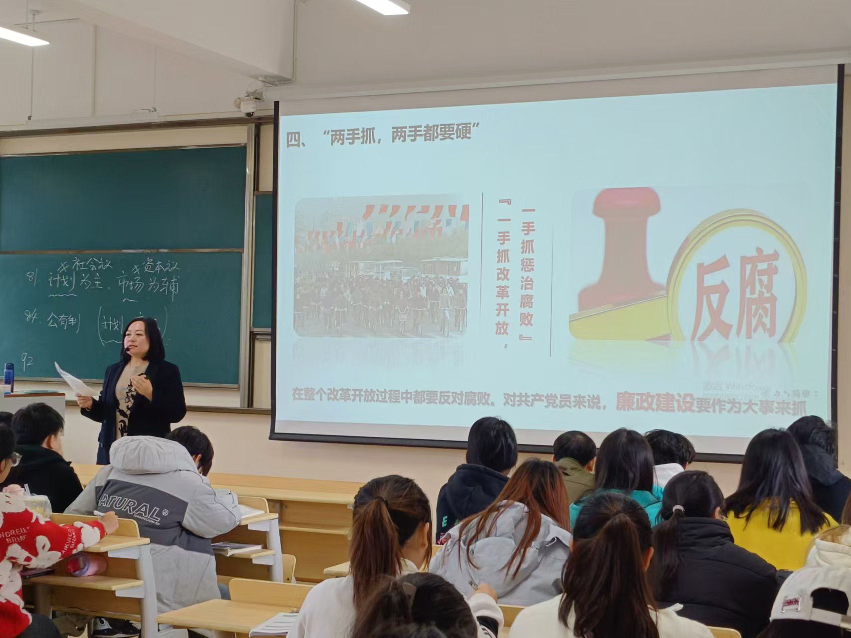课上,剌啸媛老师依托毛泽东思想和中国特色社会主义理论体系概论课程以邓小平理论中“两手抓、两手都要硬”的重要思想为指引,以一个个鲜活的案例为内容让学生们深刻领悟到廉洁自律的重要性。同时,通过组织学生开展小组讨论,分析典型案例,引导同学们树立正确的价值观和道德观。
