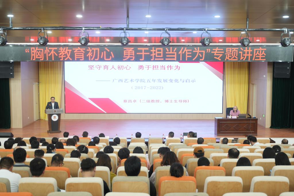 蔡昌卓教授首先分享了个人的经历,从外语学习工作、工作经历、教学研究和艺术方面创作等方面展开讲述,并分享了在任职广西师范大学副校长、广西艺术学院党委书记等多个高校领导岗位时的情怀和担当。从“党的建设”、“人才培养”、“学科建设”、“人才队伍建设”、“科研创作”、“对外交流合作”、“文化传承创新”、“办学条件建设”等多个方面深入阐释和解读了如何办好人民满意的教育。蔡昌卓教授提出,教育工作者应当“讲政治、顾大局、善团结、敢担当、做实事、保安全、守底线、乐奉献”。