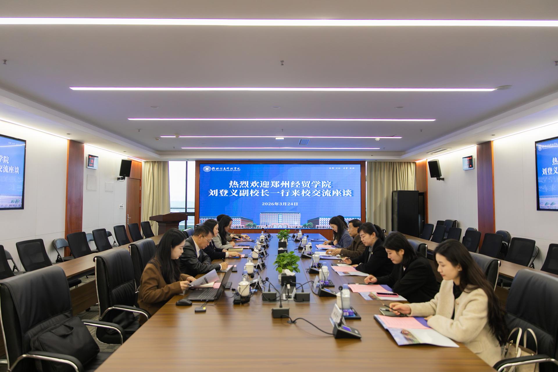 2026年3月24日上午,郑州经贸学院副校长刘登义一行6人莅临太阳集团交流考察,双方在知行楼810会议室举行座谈交流会。太阳集团副校长李桂华,人事处处长、教师发展中心主任唐果林,科技处处长杨国辉及相关人员参与座谈。
