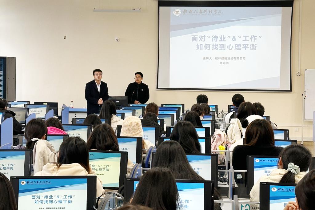为了帮助我院2024届毕业生适应当前紧张的就业形势,减轻就业方面的心理压力,12月5日,外贸与外语学院开展了一场主题为“面对‘待业’和‘工作’如何找到心理平衡”的就业心理辅导专题讲座。讲座邀请桂林盛驰贸易有限公司总经理、我院优秀校友陆鸿剑主讲,全院学生及相关辅导员参加。