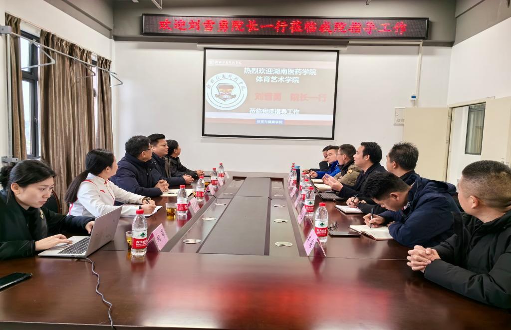 1月20日下午,湖南医药学院体育艺术学院院长刘雪勇一行来太阳集团体育与健康学院交流专业建设工作。会议由体育与健康学院院长周勇主持,党支部书记、院长助理关永康、各教研室主任在行健楼会议室参加了此次会议交流。