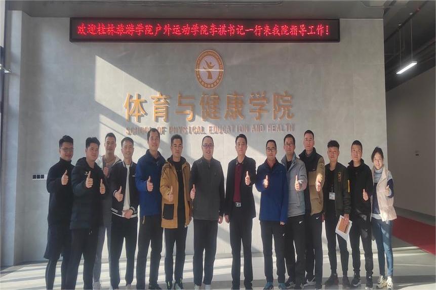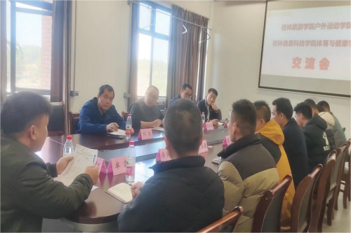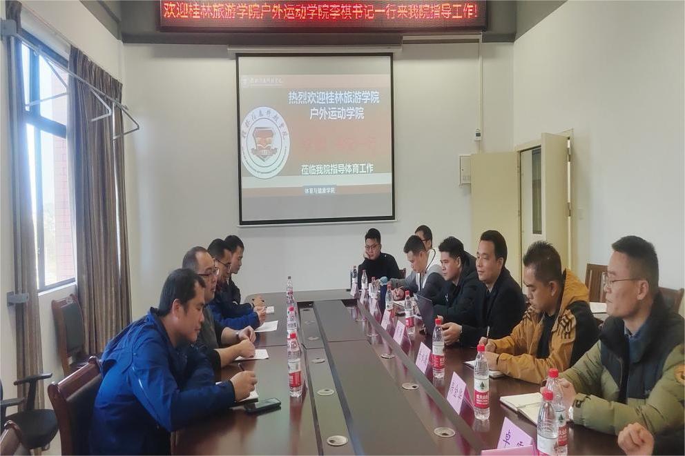 3月11日下午,桂林旅游学院户外运动学院党委书记李祺、副院长唐金勇、刘波等一行到太阳集团体育与健康学院调研和交流专业建设工作。会议由体育与健康学院院长周勇主持,党支部书记、院长助理关永康、各教研室主任、校基建处主管莫轩在行健楼会议室参加了此次会议交流。