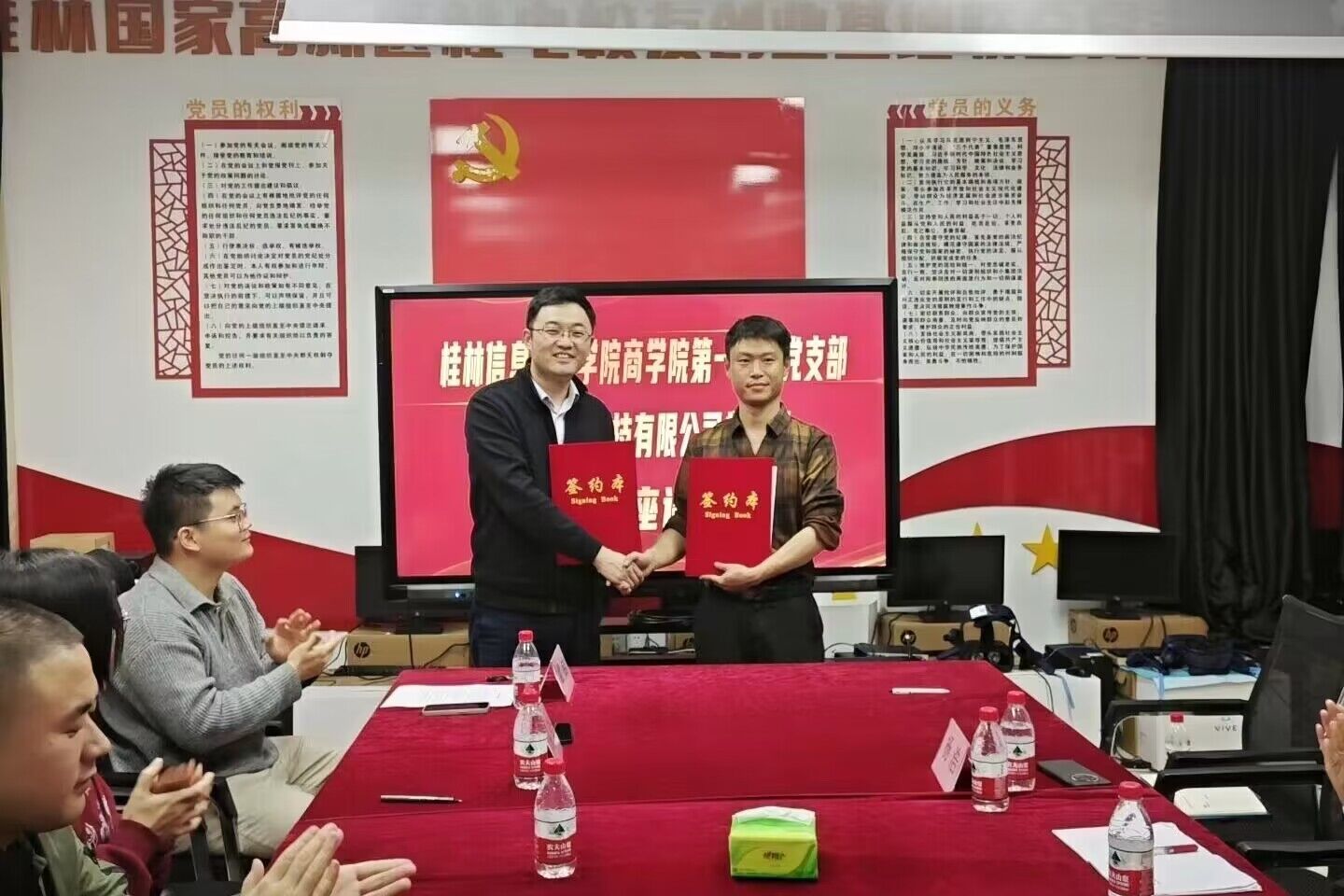 为强化党组织之间的交流合作,助推发展共赢,3月28日,商学院第一学生党支部与桂林蓝港科技有限公司党支部举行党建共建签约仪式。商学院党委书记许奇、第一学生党支部书记袁喆,桂林蓝港科技有限公司总经理、党支部书记杨浩,以及校企双方党员代表参加此次签约仪式。