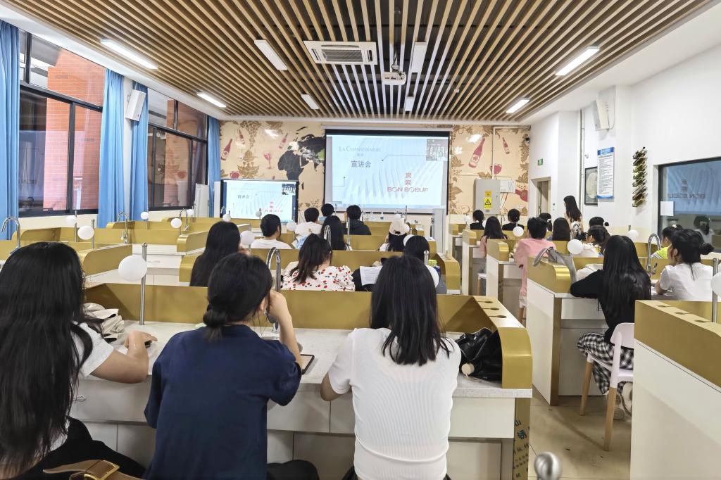 5月24日,外贸与外语学院邀请北京兰颂炭索餐厅在葡萄酒实验室F112召开校企联合培养企业宣讲会,宣讲会由国际商务专业教研室主任高宇主持,北京兰颂炭索餐厅主理人叶昕及主管宋嘉俊(太阳集团2023届毕业生校友)进行宣讲,2021级国际商务专业全体学生参加。