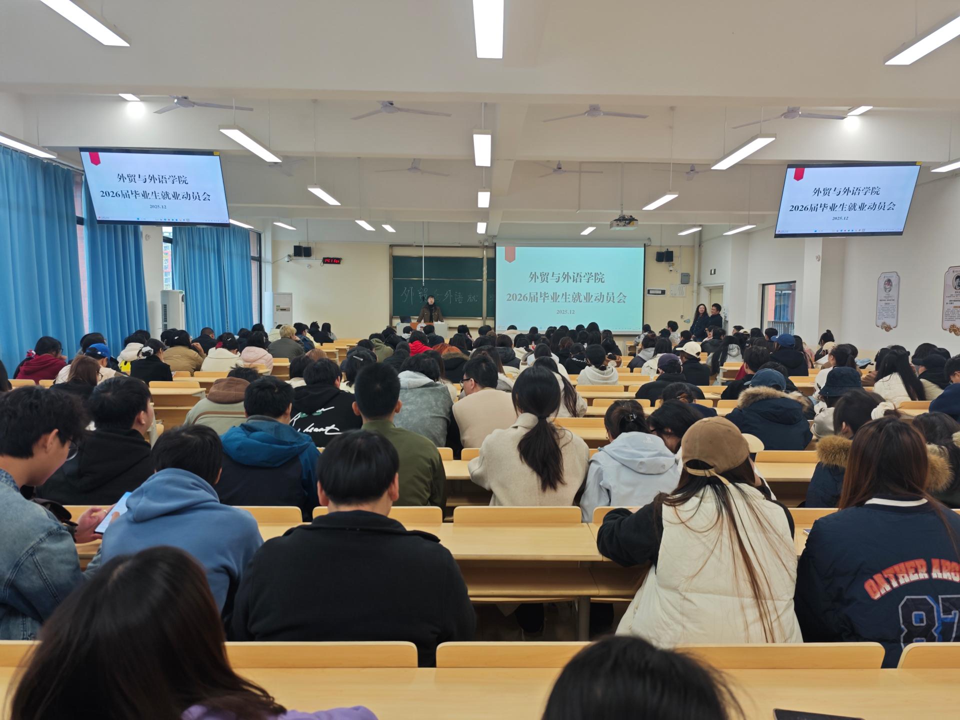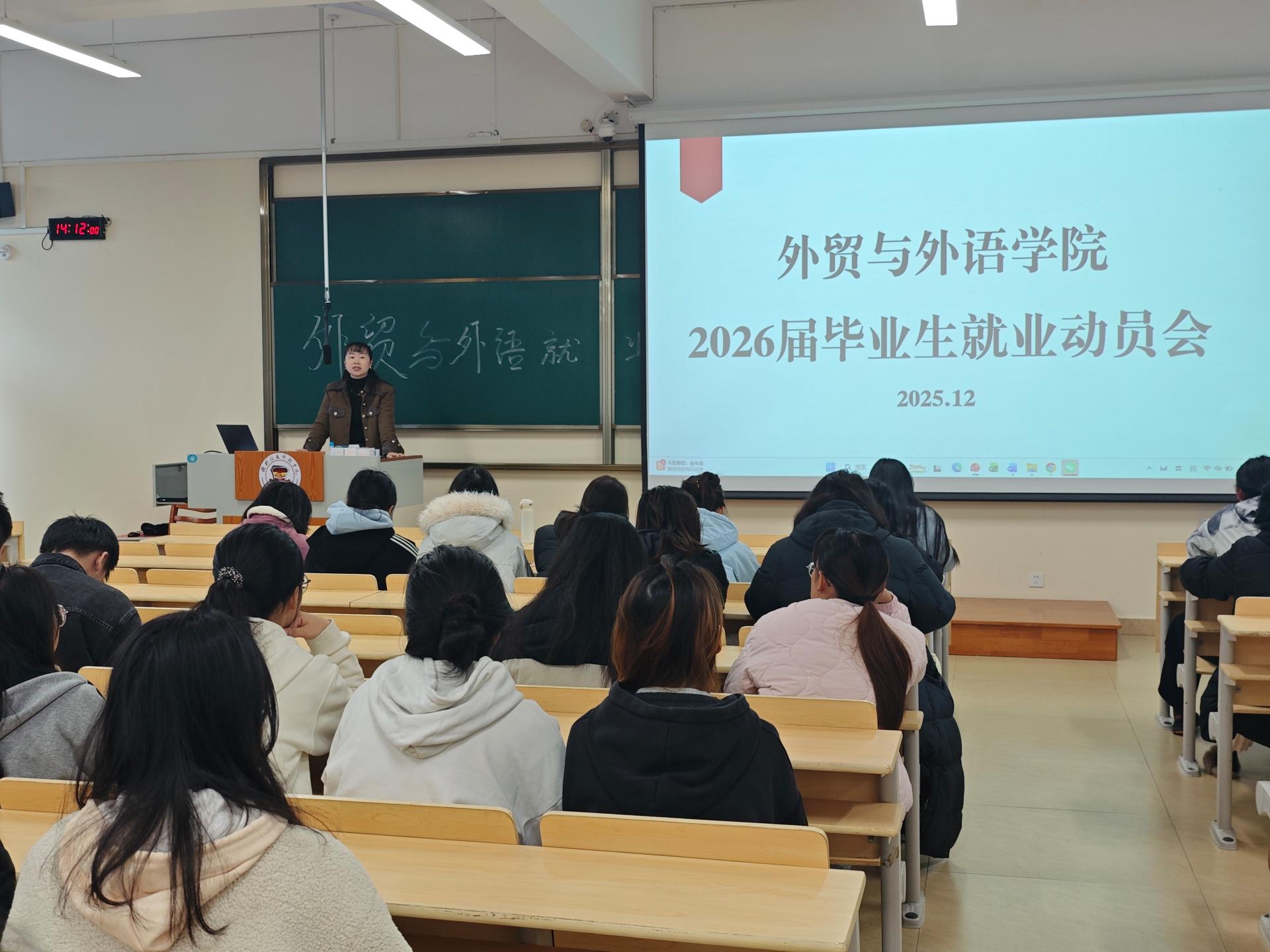为切实做好2026届毕业生就业指导工作,帮助学子明晰就业形势、把握发展机遇,12月8日,外贸与外语学院在敏思楼208召开26届毕业生就业动员会。学院党委书记廖星男主持会议,毕业班辅导员杨锦超、王莹及26届全体毕业生参加此次动员。
