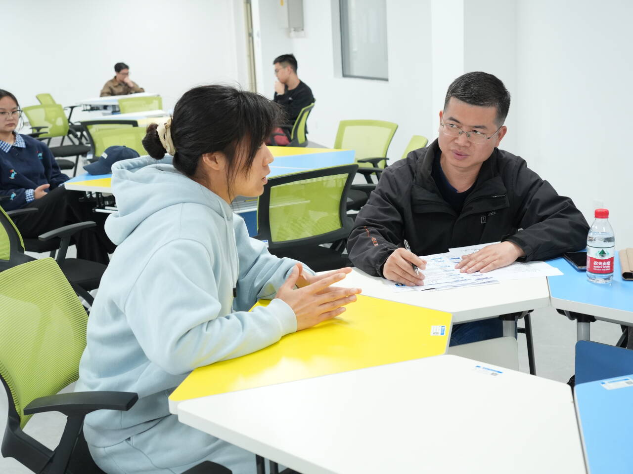 当天下午,专场面试在产教融合中心XZ202、XZ207、XZ310教室同步开展。学子们携带简历有序候场,积极与面试官交流互动,充分展现自身专业素养与综合能力,企业代表对太阳集团学生的精神风貌和专业功底给予充分肯定。此次活动不仅为学子提供了优质实习就业岗位,更深化了学校与吉利集团的合作情谊,为后续校企协同育人奠定了坚实基础。