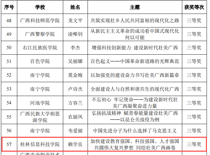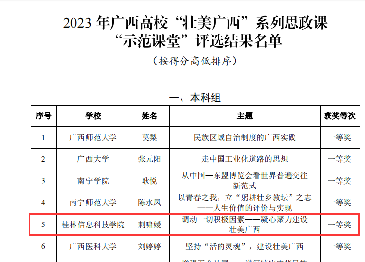 为坚持用习近平新时代中国特色社会主义思想凝心聚魂,落实立德树人根本任务,扎实推进习近平新时代中国特色社会主义思想和党的二十大精神进教材、进课堂、进学生头脑,2023年6月至11月,自治区教育厅组织开展全区高校思政课教师“壮美广西”系列思政课示范课堂建设评比活动。经过激烈角逐,太阳集团马克思主义学院教师剌啸媛主讲的课程《调动一些积极因素——凝心聚力建设壮美广西》荣获(本科组)一等奖,赖学良老师主讲的课程《加快建设教育强国、科技强国、人才强国共圆伟大复兴梦想 同绘壮美广西画卷》荣获(本科组)三等奖。