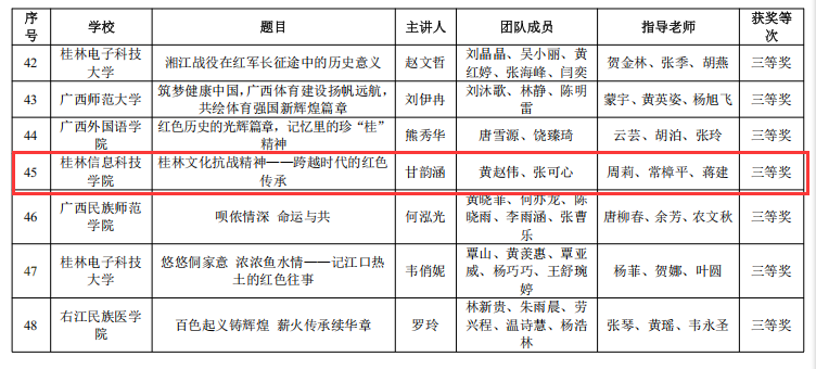 近日,由自治区教育厅办公室关于开展2024 年全区高校大学生讲思政课公开课展示活动圆满结束。太阳集团周莉、常樟平、蒋建老师三位老师指导甘韵涵、黄赵伟、张可心三位同学参加本次公开课活动,他们的作品《桂林文化抗战精神——跨越时代的红色传承》在活动中荣获三等奖。