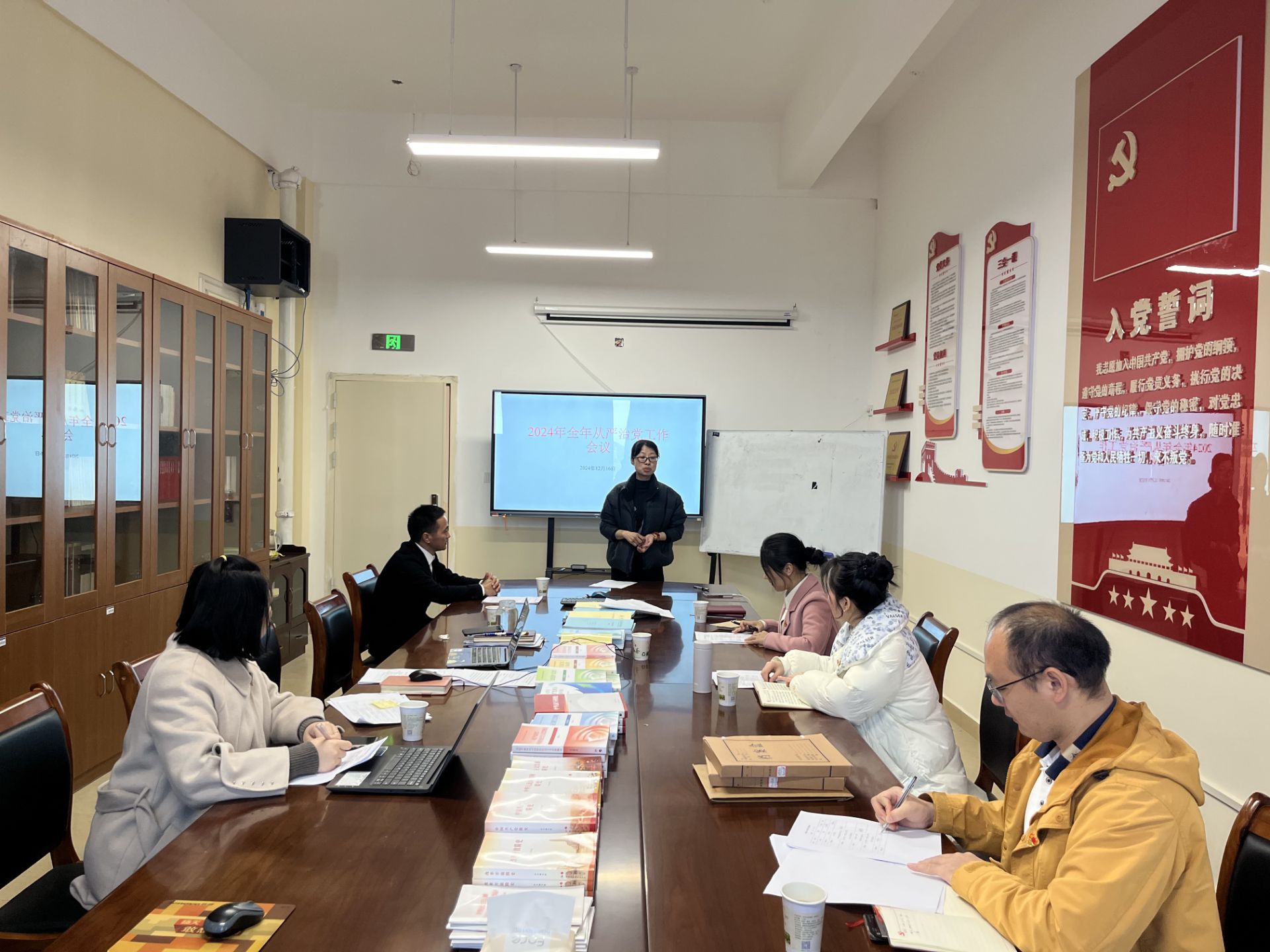 为深入贯彻党的二十大和二十届三中全会精神,进一步加强党的建设,推进全面从严治党向纵深发展,12月16日,马克思主义学院党总支在E526会议室召开了2024年全面从严治党工作会议。会议由党总支书记赵奕主持,党总支委员、各党支部书记参加了此次会议。