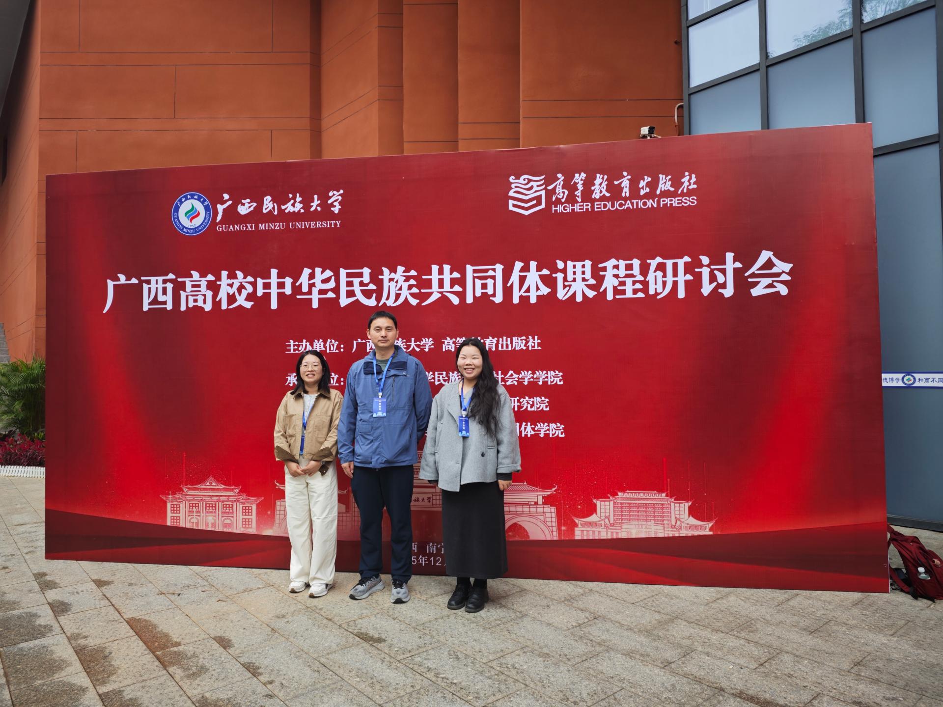 此次研讨会为学院深化中华民族共同体意识教育提供了宝贵经验。学院将以此次学习为契机,充分吸收专家们的理论成果和教学经验,结合学校实际,创新教学方法,将中华民族共同体意识教育有机融入思政课程体系。通过优化课程设计、丰富教学手段,切实提升课程的思想性、理论性和亲和力,引导青年学生铸牢中华民族共同体意识,为培养担当民族复兴大任的时代新人贡献力量。为进一步推动中华民族共同体意识教育深度融入高校思政课程体系,切实提升教学质量和育人成效,12月13日,马克思主义学院副院长赖学良率骨干教师蒋春妹、荣雪辰赴南宁参加广西高校《中华民族共同体概论》课程研讨会。