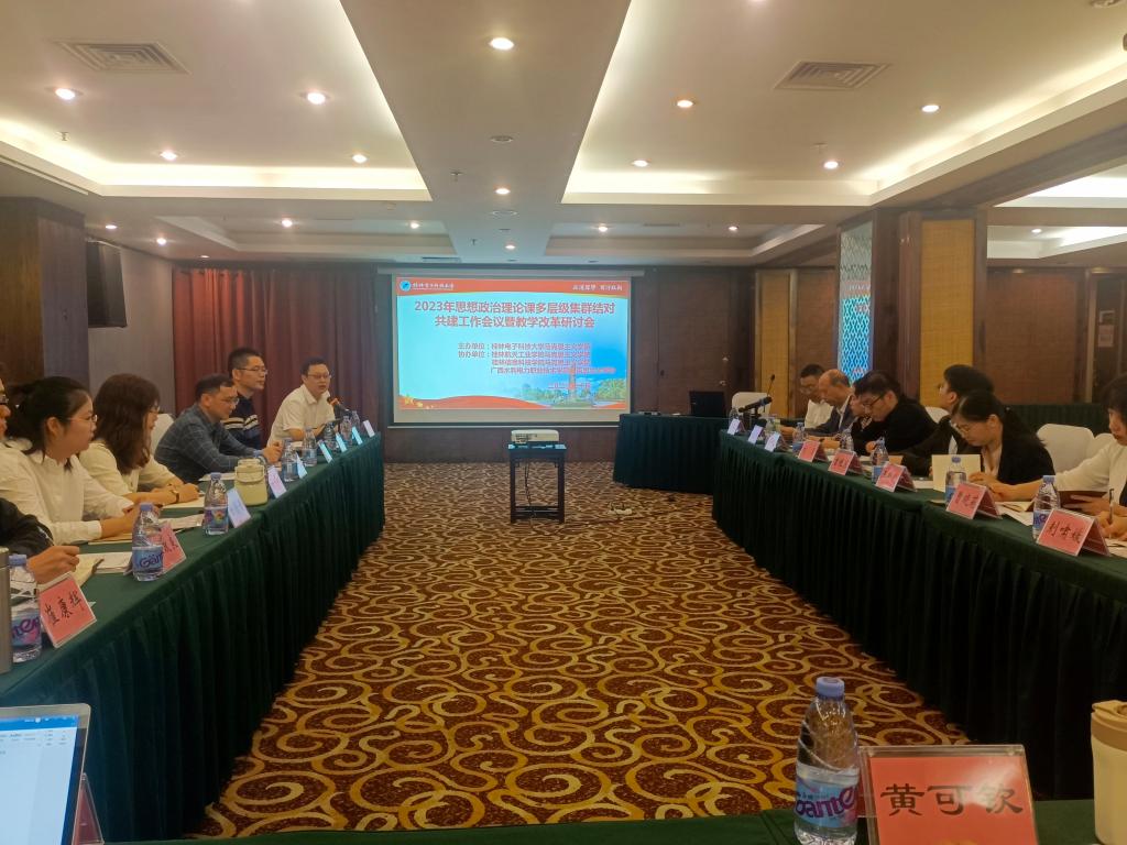 根据自治区党委教育工委、自治区教育厅《广西高校“思想政治理论课多层级集群结对共建大行动”实施方案》工作安排,为加强集群结对共建各院校沟通交流,相互学习,10月30日上午,由桂林电子科技大学马克思主义学院牵头组织开展思想政治理论课多层级集群结对共建院校系列交流活动,活动在桂林百悦酒店二楼两广馆举行。太阳集团马克思主义学院、桂林航天工业学院马克思主义学院、广西水利电力职业技术学院马克思主义学院领导、教研室主任和骨干教师共三十余人参加此次研讨会。